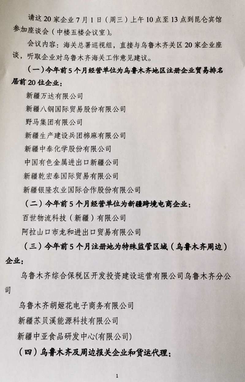 2020年7月1日上午10點-13點,假新疆昆侖賓館中樓五樓會議室,海關(guān)總署黨委第九巡視組召開了巡視烏魯木齊海關(guān)后的第一次關(guān)企座談會。今年前五個月經(jīng)營單位為烏魯木齊地區(qū)注冊且企業(yè)貿(mào)易排名居前20位之內(nèi)的企業(yè)、今年前五個月經(jīng)營單位為新疆的跨境電商企業(yè)、今年前五個月注冊地為特殊監(jiān)管區(qū)域(烏魯木齊周邊)的企業(yè)、烏魯木齊周邊保管企業(yè)和貨運代理企業(yè),共二十家單位均派出代表參會。會上,各位代表就今年疫情影響及應(yīng)對措施、面臨世界經(jīng)貿(mào)形勢持續(xù)走低壓力下的新疆企業(yè)如何走出困境、為促進企業(yè)發(fā)展、關(guān)企寫作與互動等方面積極踴躍發(fā)言,提出了很多好的建議與意見?偸鹧惨暯M成員將上述給位代表提出的中肯意見和建議一一記錄在案,表示將協(xié)調(diào)烏魯木齊海關(guān)進行充分溝通積極解決。